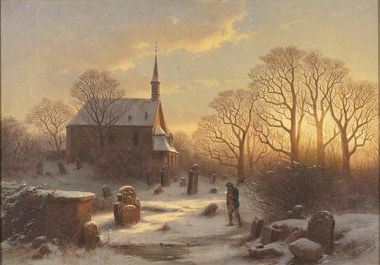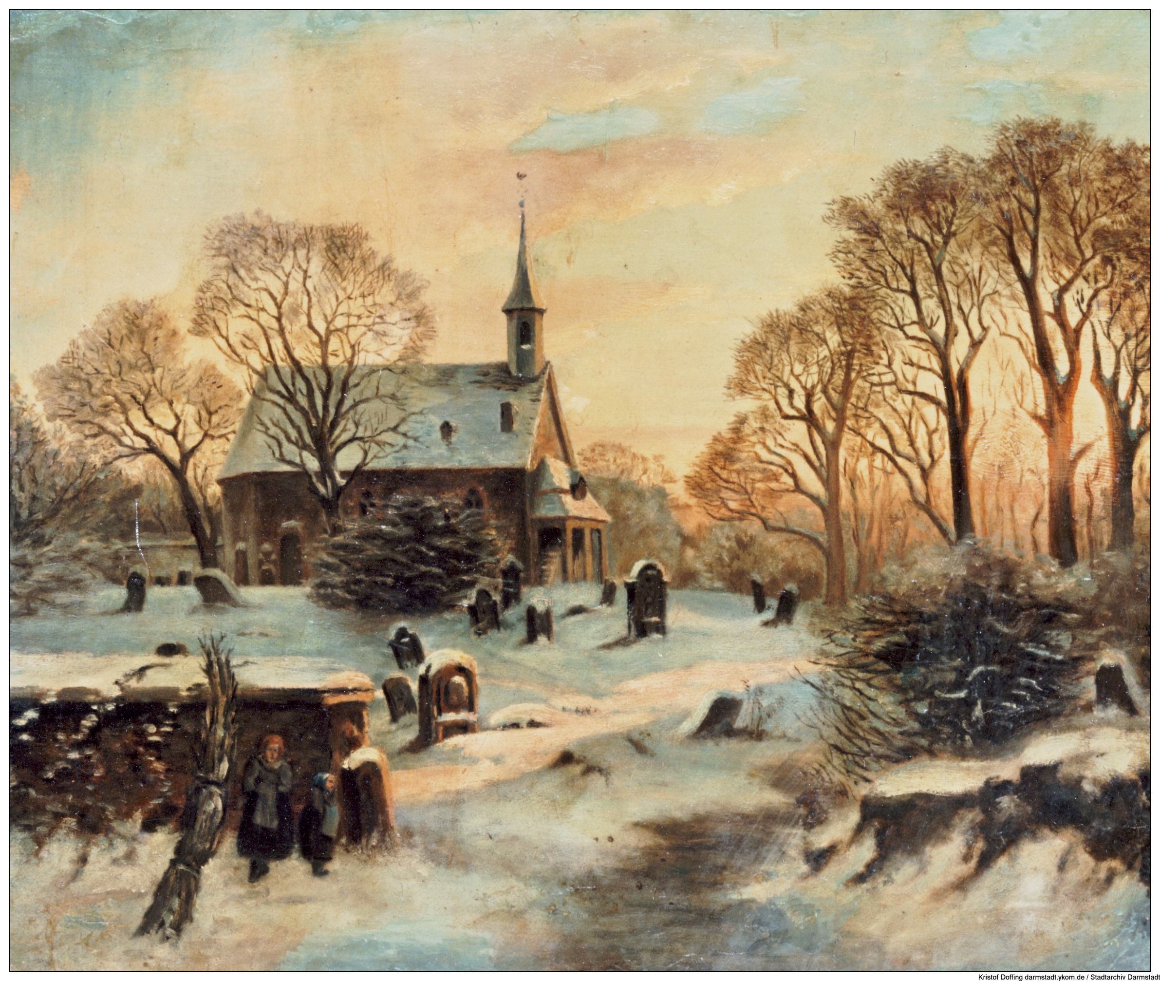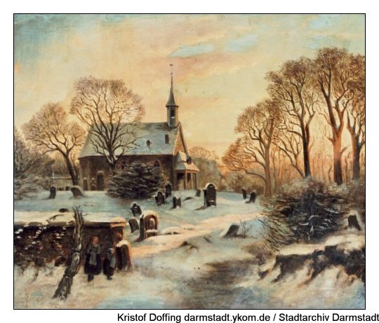 Stadtarchiv Darmstadt: Stadtkapelle und alter Friedhof, ohne Datum, unbekannter Künstler. Möglicherweise eine Vorstudie zu oder inspiriert durch ein Bild von Paul Weber, siehe auch: PAUL WEBER, 1823-1916 Winter sunset scene with church graveyard and gravedigger. Signed lower right "Paul Weber 1865". Oil on canvas relined on aluminum