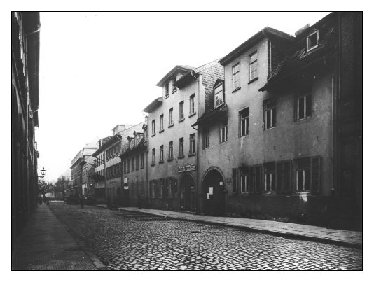 Frankfurter Str. 49 und 51 (#) : Blick Richtung Nordosten, Frankfurter Str. 49 und 51, links dahinten Nr. 53, rechts Trümmer der Nr. 41. Rechts evtl. Blick auf die Schwanenstr. 75 (Robert-Schneider-Str.)